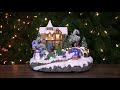 Enjoy the innocence of Christmas joy with this musical and lighted tabletop decoration. It features a yellow cottage with blue window sills and a door that is covered in iridescent snow and surrounded by snow-covered trees. The scene is scattered with a snowman, dog, deer, man, and a woman with a child standing on the bridge, making it more adorable.