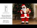 This animated African American Santa is deep thought as he writes his famous Naughty or Nice list. Wearing gold-rimmed glasses, black boots, and his classic red suit with plush white trim that is illuminated by clear LED lights, this black Santa figure exudes timeless holiday cheer. In one hand he holds a pencil and notebook, carefully checking names, while also holding a soft plush teddy bear, ready for someone special on his “Nice” list. As cheerful Christmas melodies play, Santa comes to life with his movements and glowing coat to create a warm, festive ambiance. Finished with a jingle bell on his hat, this lighted Christmas decoration makes a glowing centerpiece and a treasured holiday tradition for years to come.